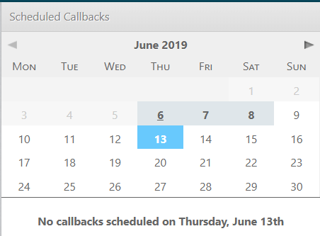 The selected date is shown in blue (13th June). Dates in dark grey (6th, 7th and 8th of June) indicate there are callbacks scheduled on those days. Dates that have passed are displayed in light grey and cannot be selected.